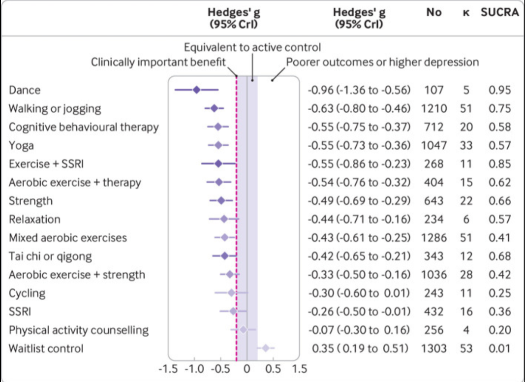 This study reminds me of one of my favorite studies, a meta-analysis (a composition of multiple studies. A metaanalysis is one of the highest reliability levels of data), which showed that even small amounts of exercise can help to treat depression (see table below). Strength training and yoga were the most popular among study participants for helping with depression. Studies like this, that are controlled trials with placebos, can help me bet that the results of exercise slowing cognitive decline from the above study are at least in part causation, not correlation."