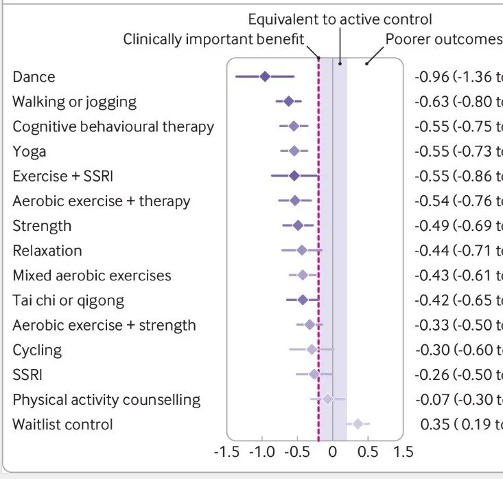 >> Dr. Neuman: "The study shows multiple effective forms of exercise: cycling, strength training, jogging, tai chi, and yoga. Dancing had the largest effect size of any form of exercise. Here is my favorite dance song so we can all dance the depression away!"